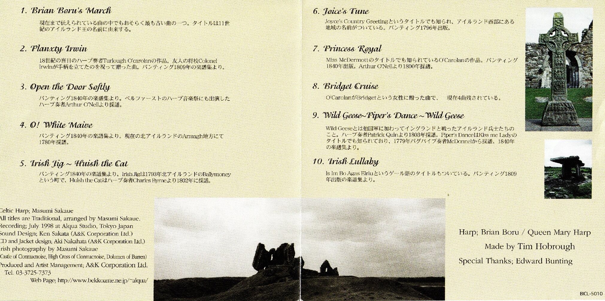 なお今回演奏に使用したハープは、スコットランドのハープ製作者ティム・ホブロウが作った、柳の樹の胴体に真鍮の弦を張った14,15世紀の通称「ブライアンボルーハープ」又は「クイーンメアリーハープ」と呼ばれているもののレプリカです。